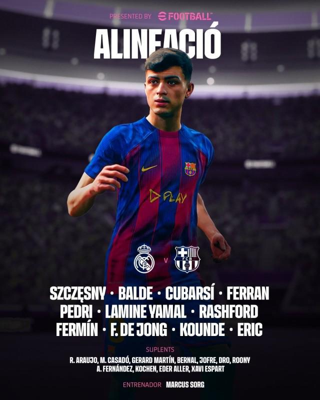北京时间11月26日,西甲第10轮焦点大战,巴塞罗那客战皇家马德里,打响赛季首回合国家德比。红蓝军团公布先发,亚马尔领衔,拉什福德先发,什琴斯尼驻门。弗利克助教马库斯·佐尔格督战。 巴塞罗那首发:什琴斯尼/亚历克斯·巴尔德、库巴西、费兰·托雷斯、佩德里、亚马尔、拉什福德、费尔明、弗伦基·德容、孔德、埃里克·加西亚 替补:阿劳霍、卡萨多、赫拉德·马丁、贝尔纳尔、托伦茨、德罗·费尔南德斯、巴尔德吉、托尼·费尔南德斯、科琴、埃德尔·阿列尔、埃斯帕特