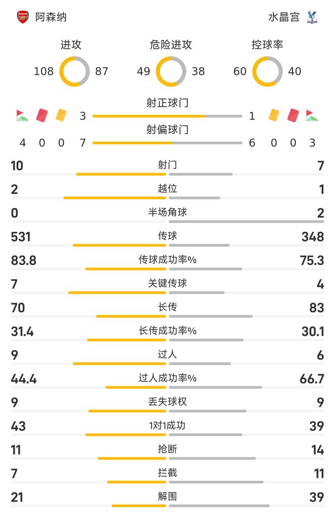 控球率方面,阿森纳达到60%,水晶宫则为40%。传球数据方面,阿森纳全场531次传球,其中包含7次关键传球,传球成功率83.8%;反观水晶宫全场348次传球,其中包含4次关键传球,传球成功率75.3%。