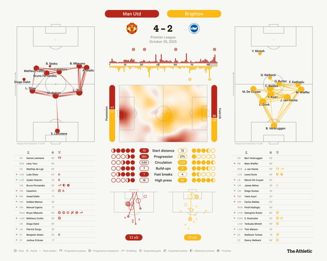 训练时间的积累也开始显现成效。过去,阿莫林的中卫在压上参与中场逼抢时常显得犹豫——布鲁诺·费尔南德斯在曼市德比失利后也曾提出过这一问题。但这一次,卢克·肖完美地把握了时机,从吕特脚下断球并发动进攻,制造了卡塞米罗的进球。同时,德里赫特在盯防维尔贝克时采取了高位人盯人策略,有时甚至压到布莱顿半场,虽然冒险,但也收到了回报。