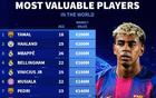 德转列世界足坛身价前15:亚马尔、哈兰德、姆巴佩2亿并列第一
